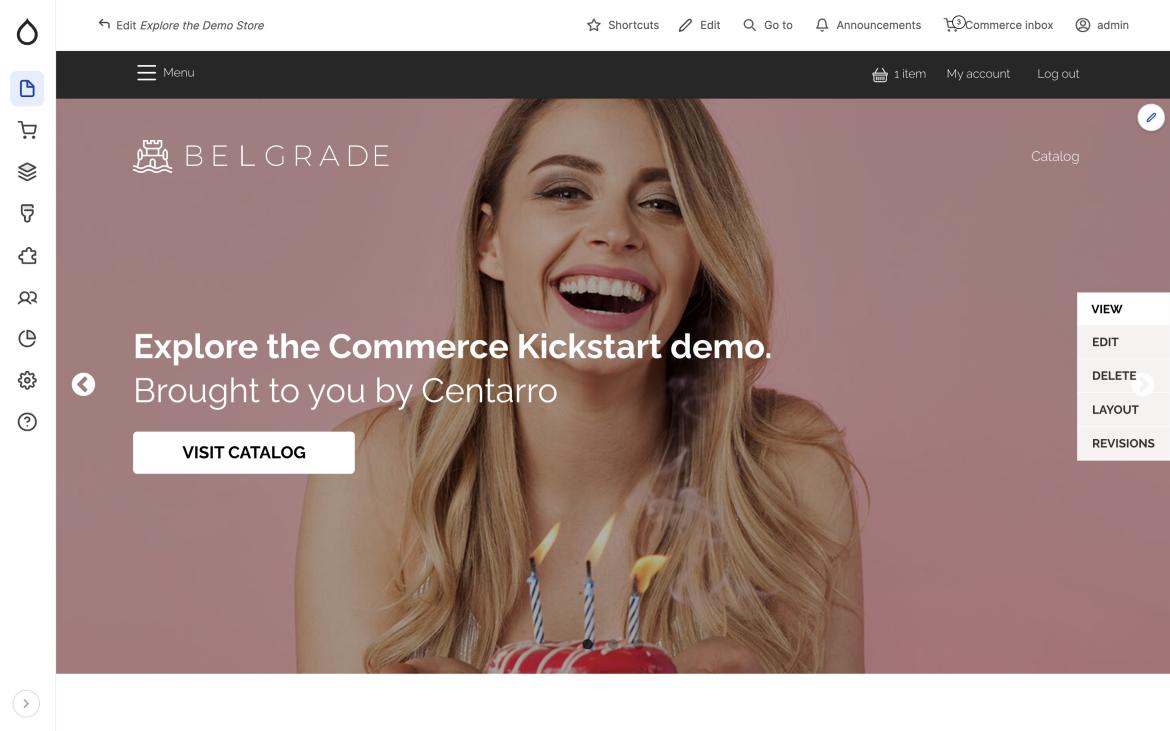 With Commerce Kickstart 4.x, we had all of the ingredients to rebuild the distribution as a site template. Its demo store already created a complete eCommerce experience with multiple product types, a faceted search interface, and sample content. It added modules to expand on the Commerce Core feature set, and it installed and configured a variety of modules to improve Layout Builder and integrate it tightly with our default theme, Belgrade.
